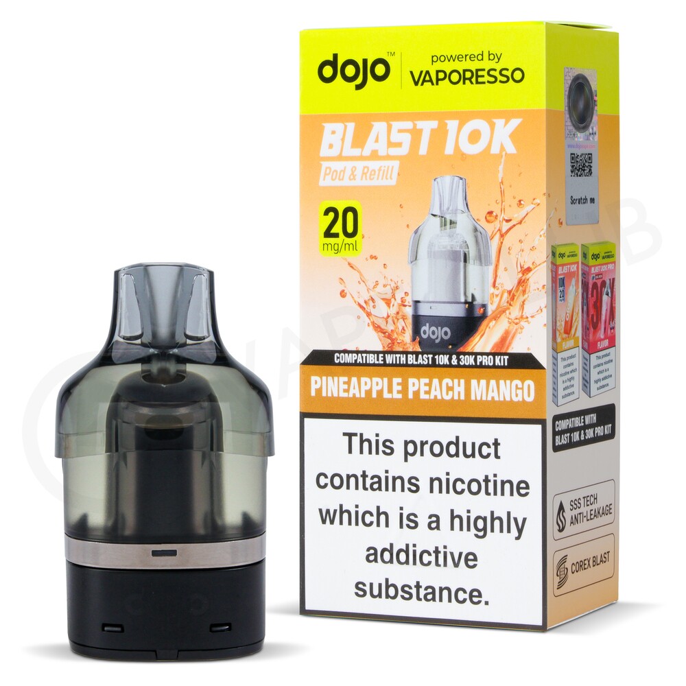 Dojo Blast 10K refill packs are filled with nic salt e-liquid. Nic salt is absorbed by the body quickly and satisfies cravings fast, while delivering a smooth throat hit. Once both the pod and container are empty, you can simply swap them for new ones. There is a wide range of different refill flavours available, featuring juicy-tasting fruit, frosty ice, and fizzy soda blends.