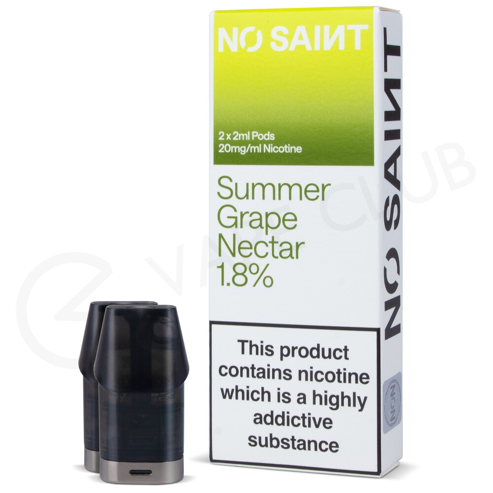 The Summer Grape Nectar No Saint prefilled pods are compatible with the No Saint pod kit. They are prefilled with 2ml of 20mg nic salt e-liquid that provides a smooth throat hit and is absorbed by the body fast to quickly satisfy cravings. Able to deliver up to 600 puffs each, they will create a discreet amount of vapour for an MTL (Mouth To Lung) inhale.